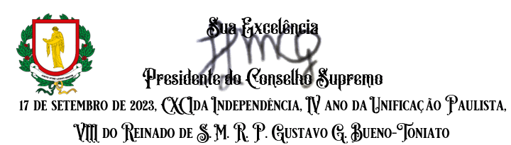 O presidente do Conselho Supremo, no uso de suas atribuições constitucionais, tendo sido aprovado em sufrágio em plenário da sessão do dia 16 de setembro de 2023, em nome desta casa, envia à referida lei para Promulgação de Sua Majestade Real e Paulista.