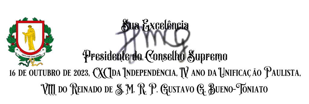 O presidente do Conselho Supremo, no uso de suas atribuições constitucionais, tendo sido aprovado em sufrágio em plenário da sessão do dia 07 de outubro de 2023, em nome desta casa, envia à referida lei para Promulgação de Sua Majestade Real e Paulista.