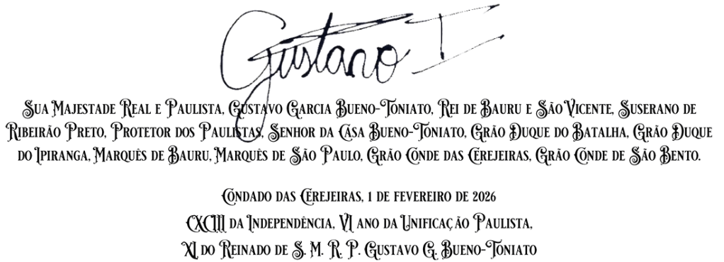 Sua Majestade Real e Paulista, no uso de suas atribuições conferidas pelo Art.4 do Registro de Ordem nº 4, como Grão Mestre da Ordem Maria Leocádia Constantina de Pompéia: