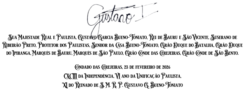 Sua Majestade Real e Paulista, no uso de suas atribuições conferidas pelo Art.4 do Registro de Ordem nº 4, como Grão Mestre da Ordem Maria Leocádia Constantina de Pompéia: